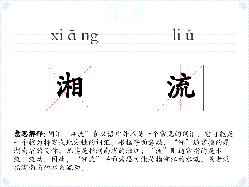 词汇“湘流”在汉语中并不是一个常见的词汇,它可能是一个较为特定或地方性的词汇。根据字面意思,“湘”通常指的是湖南省的简称,尤其是指湖南省的湘江;“流”则通常指的是水流、流动。因此,“湘流”字面意思可能是指湘江的水流,或者泛指湖南省的水系流动。