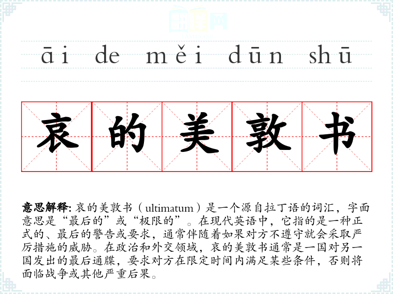 哀的美敦书(ultimatum)是一个源自拉丁语的词汇,字面意思是“最后的”或“极限的”。在现代英语中,它指的是一种正式的、最后的警告或要求,通常伴随着如果对方不遵守就会采取严厉措施的威胁。在政治和外交领域,哀的美敦书通常是一国对另一国发出的最后通牒,要求对方在限定时间内满足某些条件,否则将面临战争或其他严重后果。