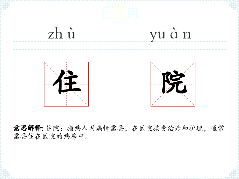 - 专业领域:在医疗领域,“住院”涉及更具体的医疗程序和护理标准,如“住院患者需要定期进行血压监测。”