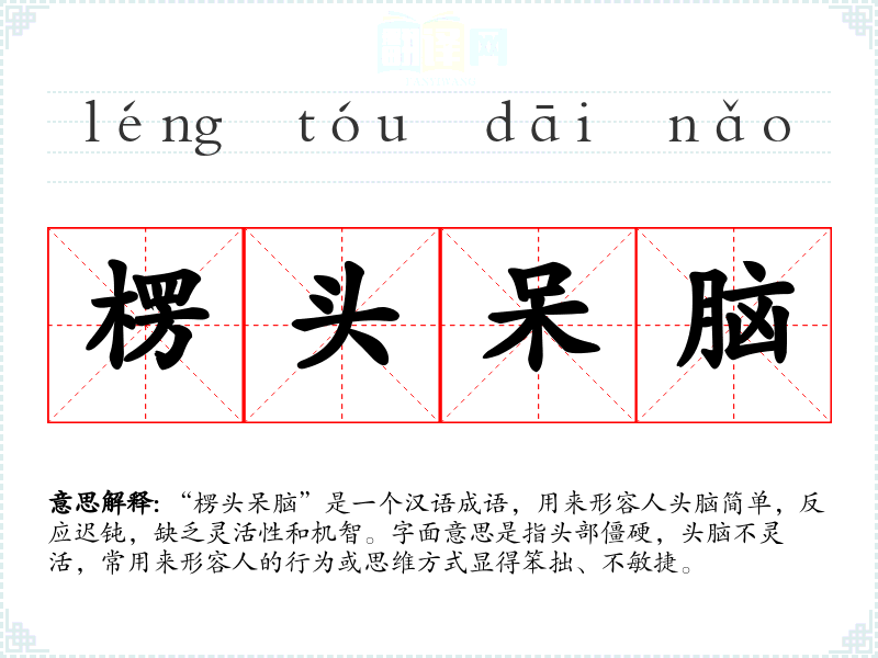“楞头呆脑”是一个汉语成语,用来形容人头脑简单,反应迟钝,缺乏灵活性和机智。字面意思是指头部僵硬,头脑不灵活,常用来形容人的行为或思维方式显得笨拙、不敏捷。