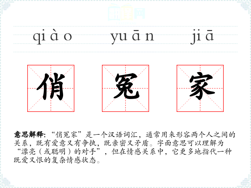 “俏冤家”这个词在汉语中是一个富有表现力的词汇,它能够准确地描述那些既爱又恨、既亲密又矛盾的复杂情感关系。在学*语言和表达时,掌握这样的词汇可以帮助我们更精确地传达情感和思想。