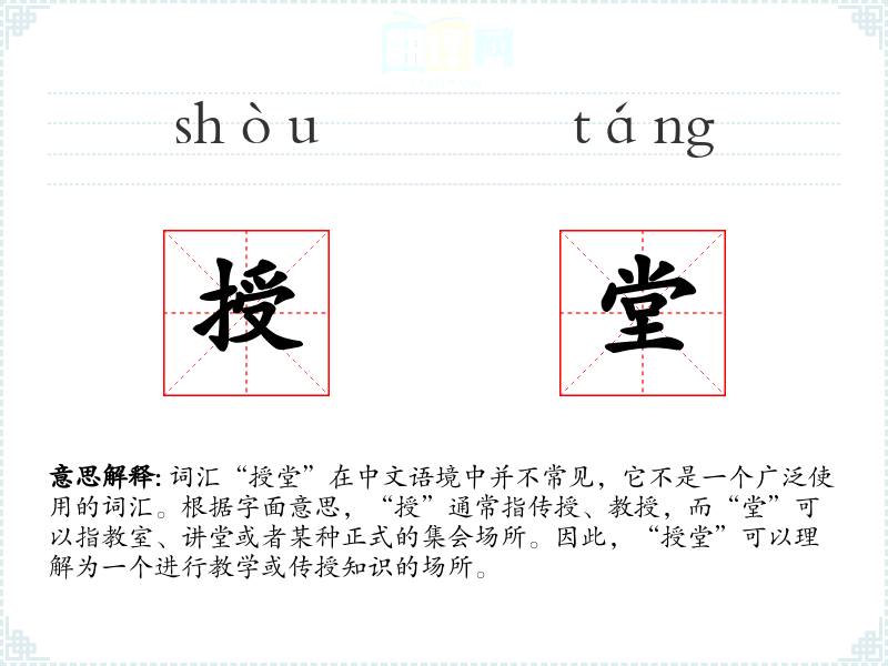 词汇“授堂”在中文语境中并不常见,它不是一个广泛使用的词汇。根据字面意思,“授”通常指传授、教授,而“堂”可以指教室、讲堂或者某种正式的**场所。因此,“授堂”可以理解为一个进行教学或传授知识的场所。