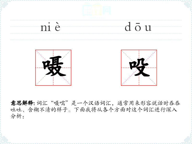 词汇“嗫嚅”是一个汉语词汇,通常用来形容说话时吞吞吐吐、含糊不清的样子。下面我将从各个方面对这个词汇进行深入分析: