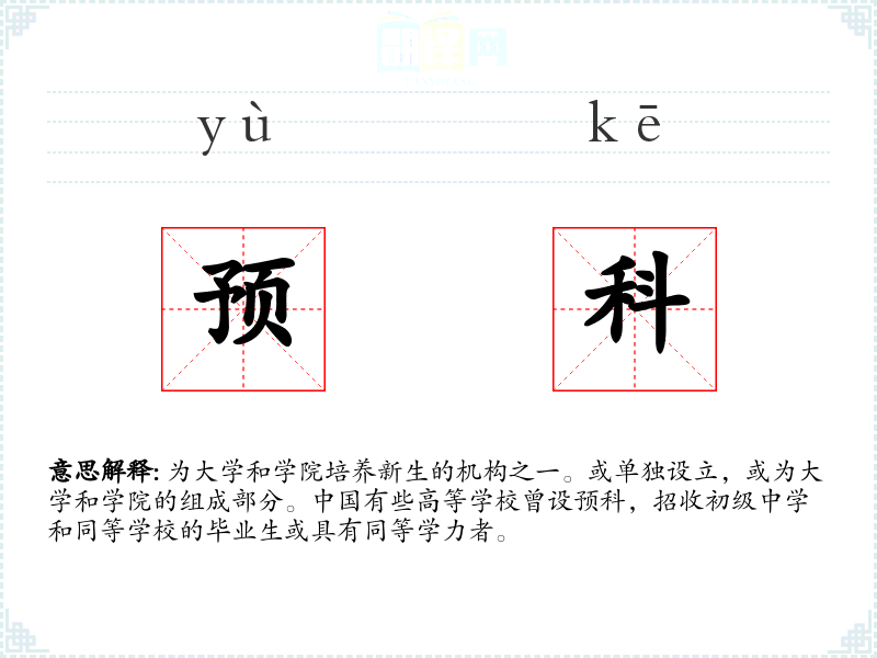 为大学和学院培养新生的机构之一。或单独设立,或为大学和学院的组成部分。中国有些高等学校曾设预科,招收初级中学和同等学校的毕业生或具有同等学力者。