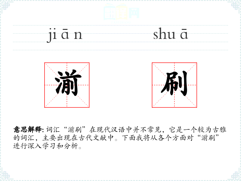“湔”字在古代汉语中意为洗涤,而“刷”字则有擦拭、清洗的意思。两者结合,形成了“湔刷”这个词汇,用以强调清洗的动作。随着语言的发展,这个词汇的使用频率逐渐降低,被更为通俗的词汇所替代。