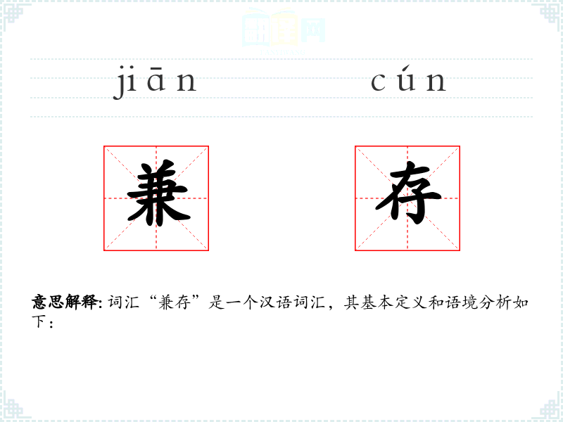 词汇“兼存”是一个汉语词汇,其基本定义和语境分析如下: