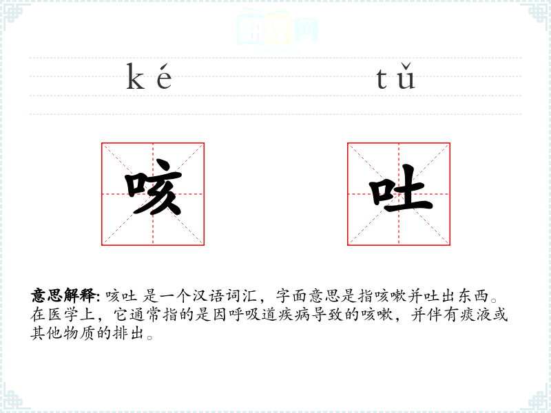 咳吐这个词由“咳”和“吐”两个字组成,其中“咳”指的是咳嗽,“吐”指的是吐出。在古代汉语中,这两个字就已经存在,并且组合使用来描述咳嗽并吐出的行为。