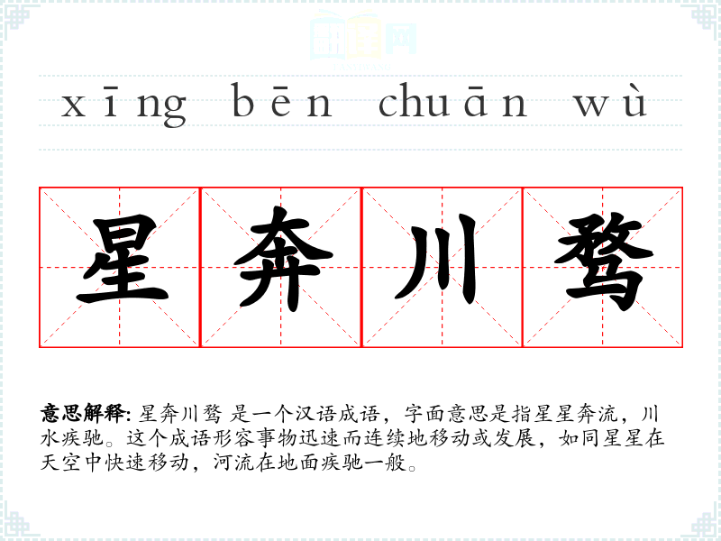 星奔川骛 是一个汉语成语,字面意思是指星星奔流,川水疾驰。这个成语形容事物迅速而连续地移动或发展,如同星星在天空中快速移动,河流在地面疾驰一般。