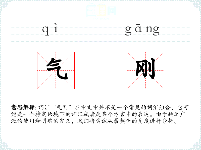 由于“气刚”不是一个标准词汇,我们无法给出确切的字面意思和基本含义。它可能是由“气”和“刚”两个字组合而成的,其中“气”可以指气息、气质、气氛等,而“刚”则可以指刚强、刚硬、刚直等。