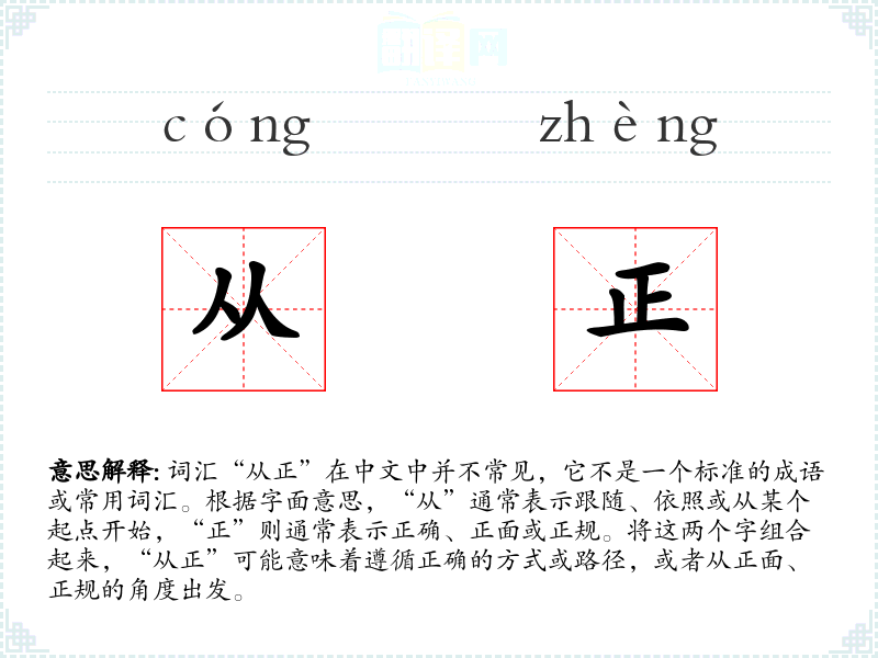 - 专业领域:在法律或道德伦理的讨论中,可能会使用“从正”来强调遵循正规程序或道德标准的重要性。