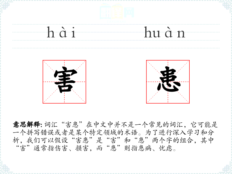 词汇“害患”在中文中并不是一个常见的词汇,它可能是一个拼写错误或者是某个特定领域的术语。为了进行深入学*和分析,我们可以假设“害患”是“害”和“患”两个字的组合,其中“害”通常指伤害、损害,而“患”则指患病、忧虑。