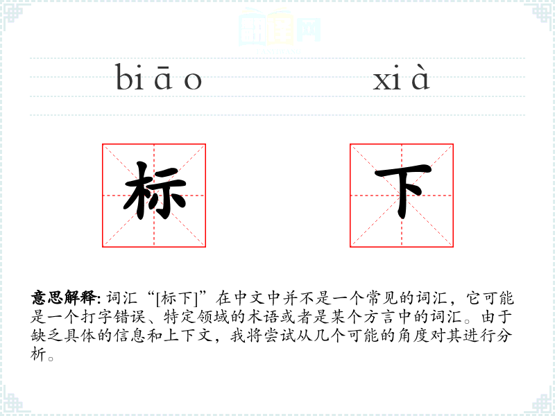 由于“[标下]”不是一个标准的中文词汇,我们无法给出确切的字面意思和基本含义。它可能是“标记下”或“标注下”的缩写或误写,意味着在某物下方做标记或注释。