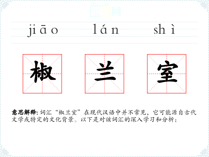 词汇“椒兰室”在现代汉语中并不常见,它可能源自古代文学或特定的文化背景。以下是对该词汇的深入学*和分析: