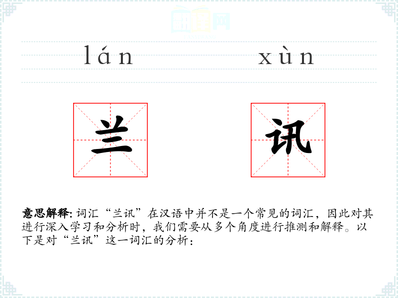 “兰讯”字面意思可以解释为“兰花的讯息”或“与兰花相关的消息”。在这里,“兰”通常指兰花,是一种具有高雅、纯洁象征意义的花卉;“讯”则通常指消息、信息。