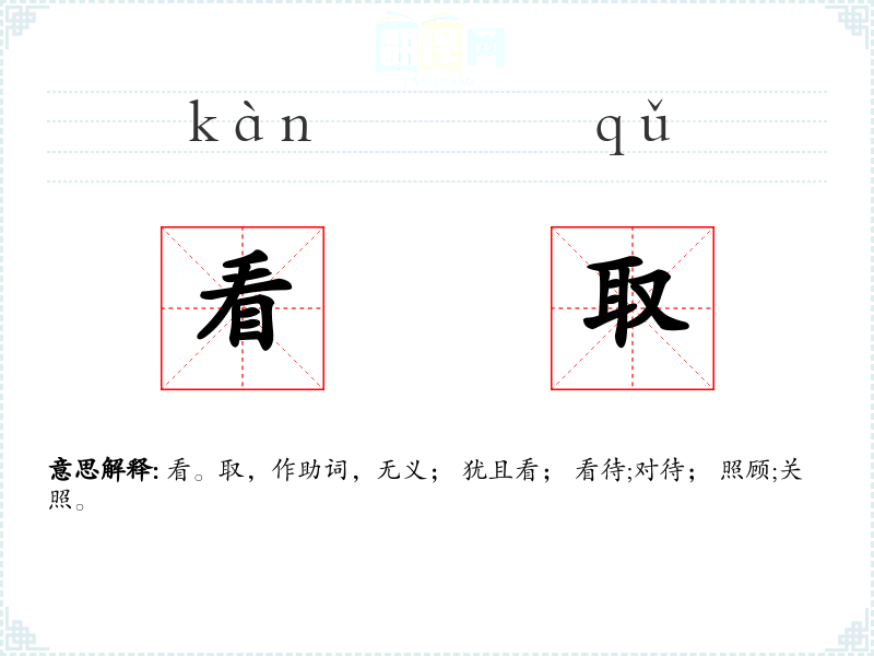 看。取,作助词,无义; 犹且看; 看待;对待; 照顾;关照。