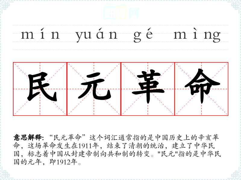 “民元革命”这个词汇通常指的是历史上的辛亥革命,这场革命发生在1911年,结束了清朝的统治,建立了中华民国,标志着从封建帝制向共和制的转变。"民元"指的是中华民国的元年,即1912年。
