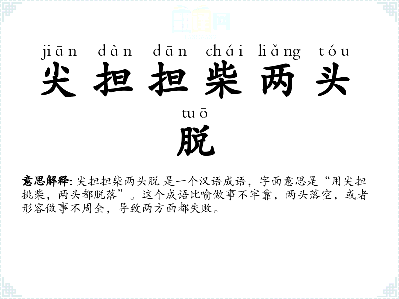 尖担担柴两头脱 是一个汉语成语,字面意思是“用尖担挑柴,两头都脱落”。这个成语比喻做事不牢靠,两头落空,或者形容做事不周全,导致两方面都失败。