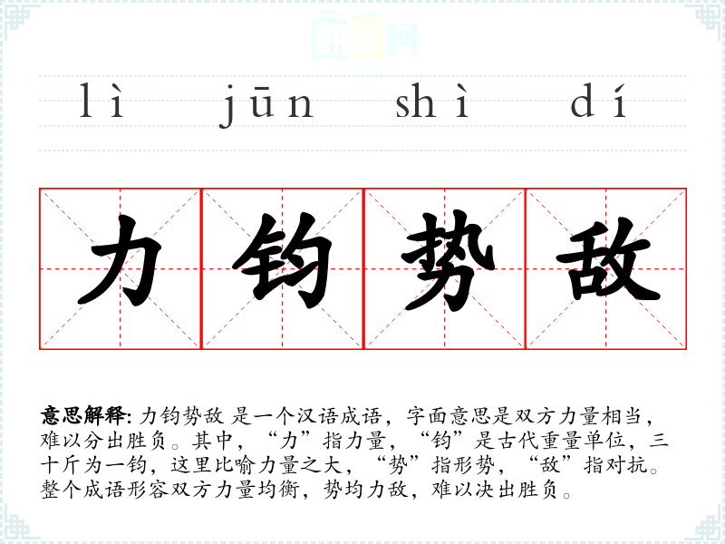 力钧势敌 是一个汉语成语,字面意思是双方力量相当,难以分出胜负。其中,“力”指力量,“钧”是古代重量单位,三十斤为一钧,这里比喻力量之大,“势”指形势,“敌”指对抗。整个成语形容双方力量均衡,势均力敌,难以决出胜负。