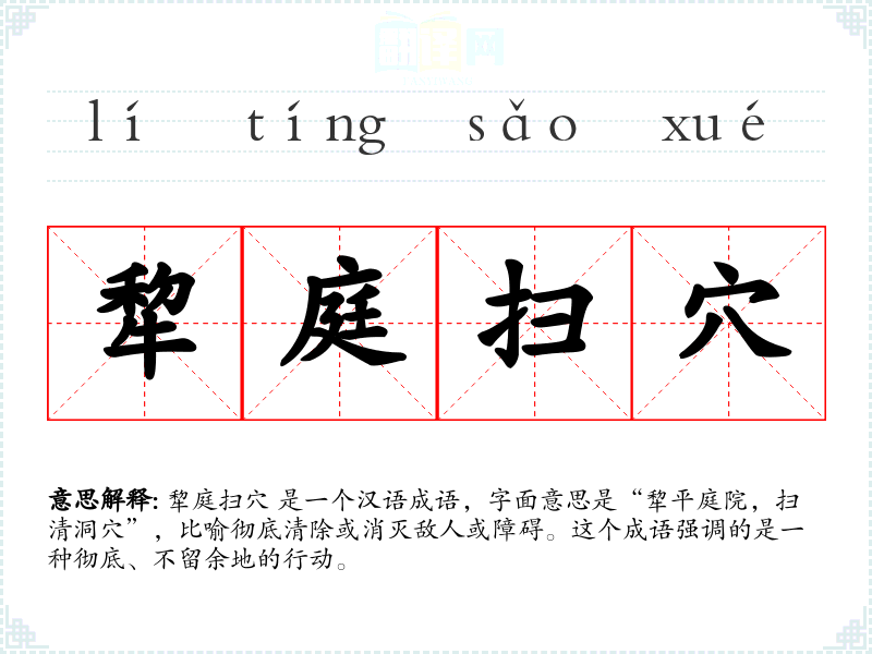 犂庭扫穴 是一个汉语成语,字面意思是“犂平庭院,扫清洞穴”,比喻彻底清除或消灭敌人或障碍。这个成语强调的是一种彻底、不留余地的行动。