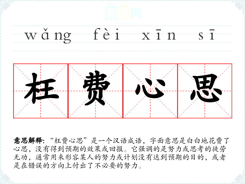 “枉费心思”是一个汉语成语,字面意思是白白地花费了心思,没有得到预期的效果或回报。它强调的是努力或思考的徒劳无功,通常用来形容某人的努力或计划没有达到预期的目的,或者是在错误的方向上付出了不必要的努力。