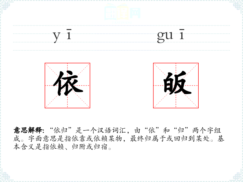 “依归”是一个汉语词汇,由“依”和“归”两个字组成。字面意思是指依靠或依赖某物,最终归属于或回归到某处。基本含义是指依赖、归附或归宿。