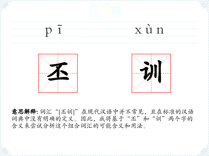 词汇“[丕训]”在现代汉语中并不常见,且在标准的汉语词典中没有明确的定义。因此,我将基于“丕”和“训”两个字的含义来尝试分析这个组合词汇的可能含义和用法。