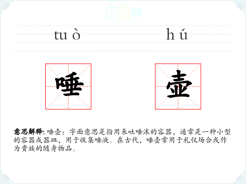 总结:唾壶作为一个历史词汇,虽然在现代生活中已不常见,但它承载了丰富的历史文化信息,是研究古代社会生活的重要文物。 反思:了解和学*这样的词汇,有助于我们更好地理解历史和文化,丰富我们的语言知识和文化素养。