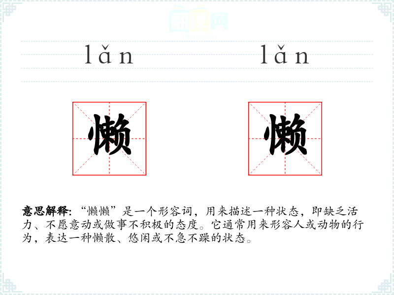 “懒懒”是一个形容词,用来描述一种状态,即缺乏活力、不愿意动或做事不积极的态度。它通常用来形容人或动物的行为,表达一种懒散、悠闲或不急不躁的状态。
