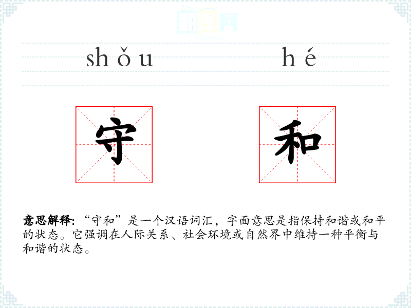 “守和”由“守”和“和”两个字组成。“守”字源自古代汉语,意为守护或保持;“和”字则表示和谐或和平。这两个字结合,强调了维持和谐状态的意图和行动。