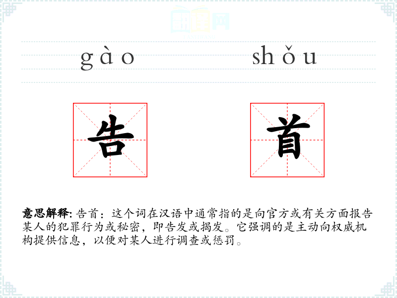 告首:这个词在汉语中通常指的是向官方或有关方面报告某人的犯罪行为或秘密,即告发或揭发。它强调的是主动向权威机构提供信息,以便对某人进行调查或惩罚。