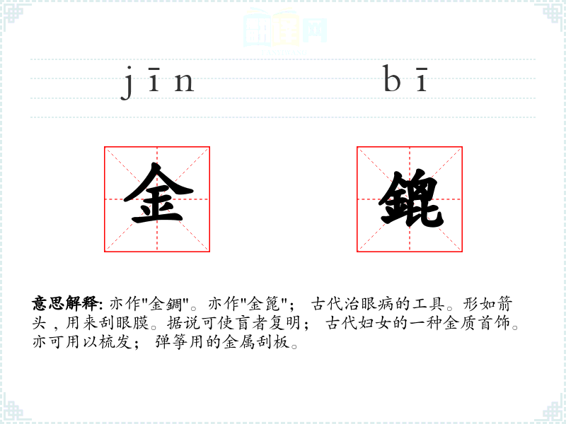 亦作"金錭"。亦作"金篦"; 古代治眼病的工具。形如箭头﹐用来刮眼膜。据说可使盲者复明; 古代妇女的一种金质首饰。亦可用以梳发; 弹筝用的金属刮板。