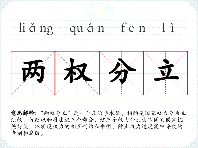 在讨论政治话题时,我经常使用“两权分立”来解释不同国家的政治体制差异,帮助他人理解权力结构对社会治理的影响。