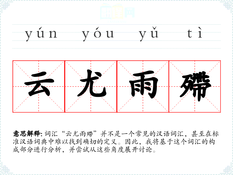 词汇“云尤雨殢”并不是一个常见的汉语词汇,甚至在标准汉语词典中难以找到确切的定义。因此,我将基于这个词汇的构成部分进行分析,并尝试从这些角度展开讨论。
