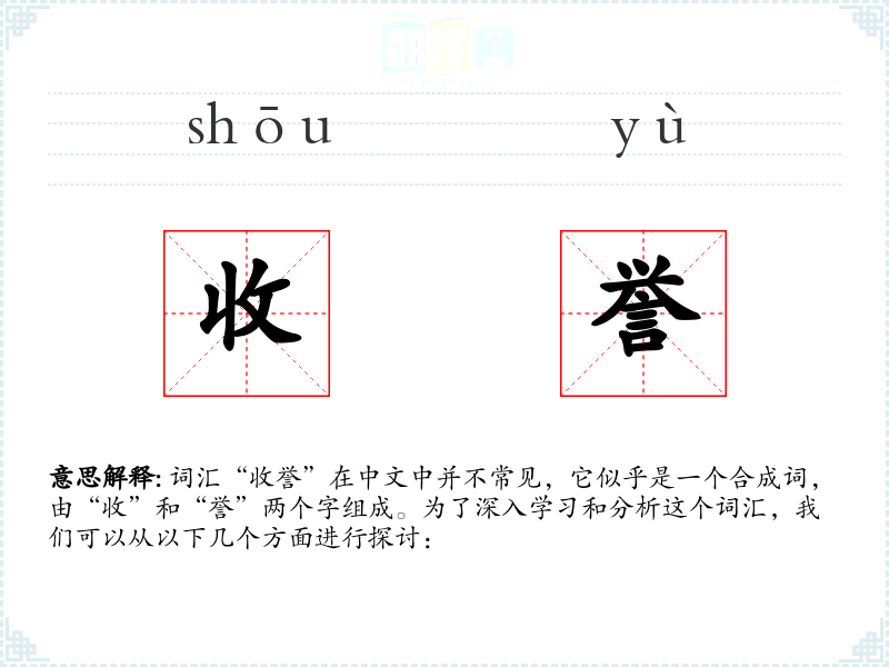 词汇“收誉”在中文中并不常见,它似乎是一个合成词,由“收”和“誉”两个字组成。为了深入学习和分析这个词汇,我们可以从以下几个方面进行探讨: