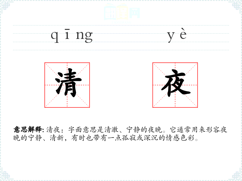 清夜:字面意思是清澈、宁静的夜晚。它通常用来形容夜晚的宁静、清新,有时也带有一点孤寂或深沉的情感色彩。
