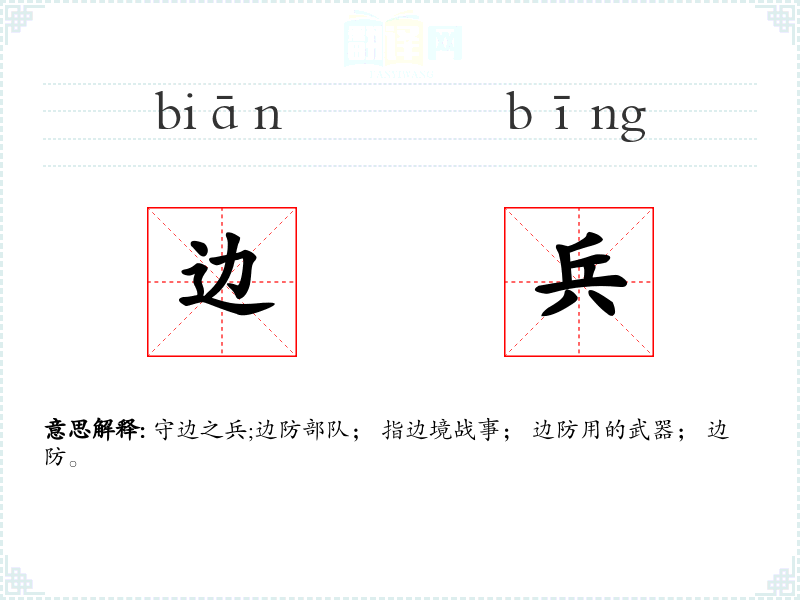 守边之兵;边防部队; 指边境战事; 边防用的武器; 边防。