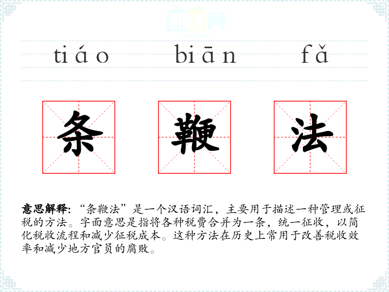“条鞭法”是一个汉语词汇,主要用于描述一种管理或征税的方法。字面意思是指将各种税费合并为一条,统一征收,以简化税收流程和减少征税成本。这种方法在历史上常用于改善税收效率和减少地方官员的腐败。