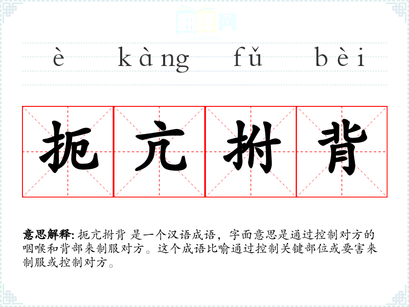 扼亢拊背 是一个汉语成语,字面意思是通过控制对方的咽喉和背部来制服对方。这个成语比喻通过控制关键部位或要害来制服或控制对方。