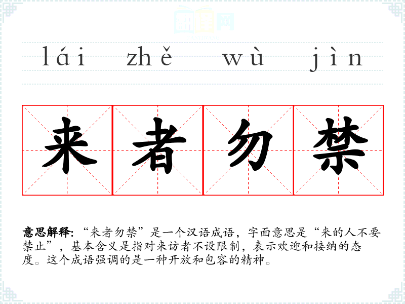 在**文化中,“来者勿禁”体现了儒家文化中的“仁爱”和“礼”的思想,强调人与人之间的和谐与尊重。在社会交往中,这个成语鼓励人们以开放的心态对待他人,促进社会的和谐与进步。