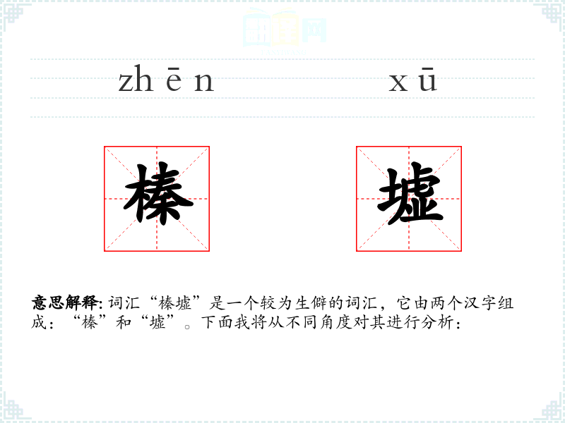 - 通过对“榛墟”的分析,我更加深刻地理解了这个词汇的多重含义和它在不同语境中的应用。在语言学习和表达中,掌握这样的生僻词汇可以丰富我的词汇量,提升我的表达能力。