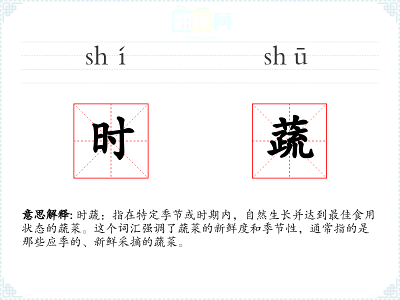 时蔬:指在特定季节或时期内,自然生长并达到最佳食用状态的蔬菜。这个词汇强调了蔬菜的新鲜度和季节性,通常指的是那些应季的、新鲜采摘的蔬菜。
