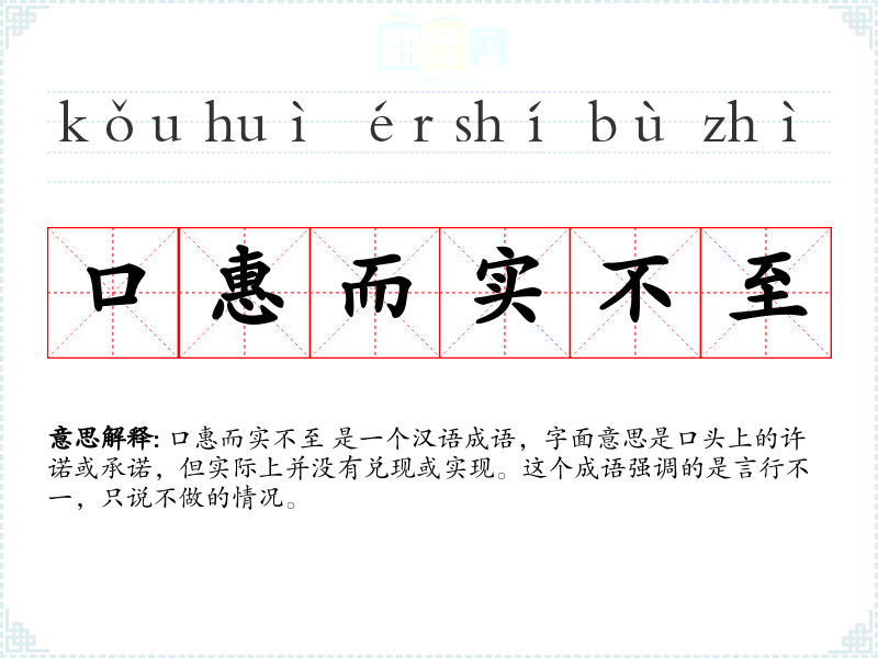 口惠而实不至 是一个汉语成语,字面意思是口头上的许诺或承诺,但实际上并没有兑现或实现。这个成语强调的是言行不一,只说不做的情况。