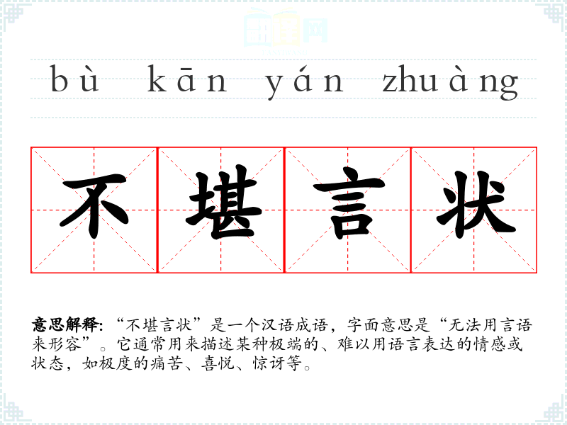 “不堪言状”是一个汉语成语,字面意思是“无法用言语来形容”。它通常用来描述某种极端的、难以用语言表达的情感或状态,如极度的痛苦、喜悦、惊讶等。
