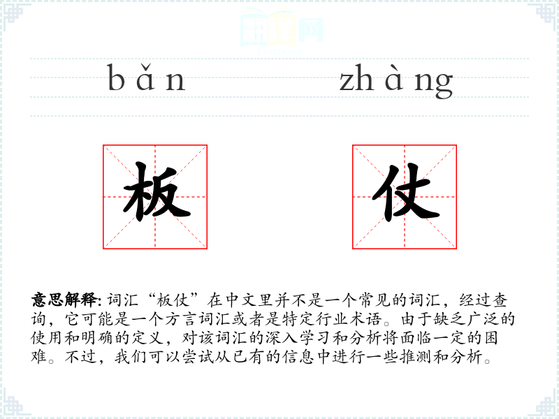 词汇“板仗”在中文里并不是一个常见的词汇,经过查询,它可能是一个方言词汇或者是特定行业术语。由于缺乏广泛的使用和明确的定义,对该词汇的深入学习和分析将面临一定的困难。不过,我们可以尝试从已有的信息中进行一些推测和分析。