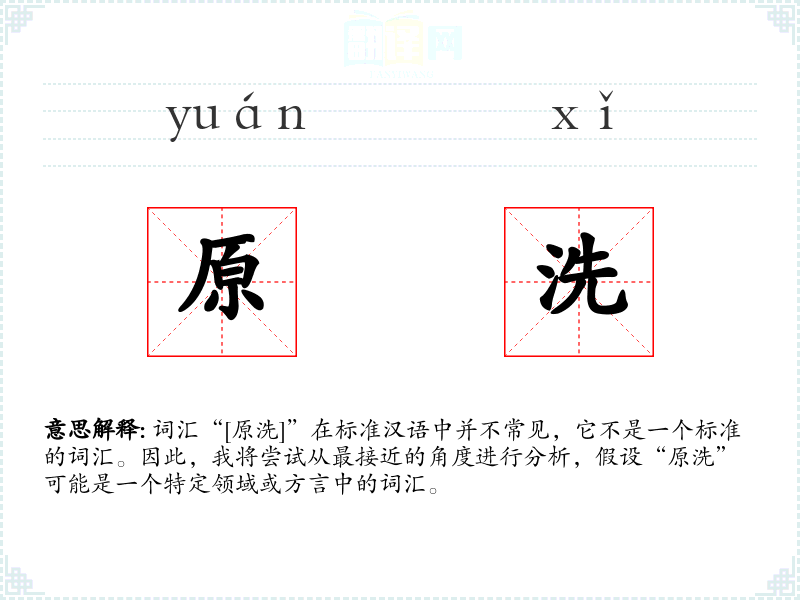 词汇“[原洗]”在标准汉语中并不常见,它不是一个标准的词汇。因此,我将尝试从最接近的角度进行分析,假设“原洗”可能是一个特定领域或方言中的词汇。