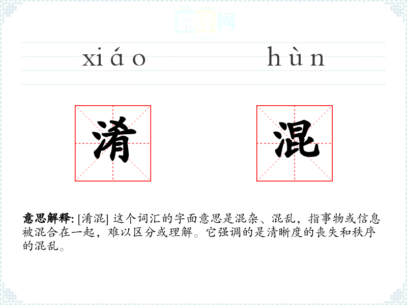 [淆混] 这个词汇的字面意思是混杂、混乱,指事物或信息被混合在一起,难以区分或理解。它强调的是清晰度的丧失和秩序的混乱。