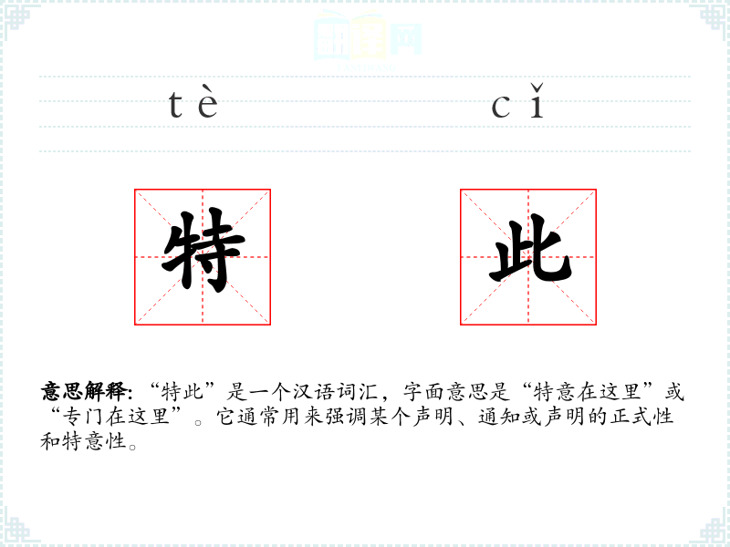 “特此”是一个汉语词汇,字面意思是“特意在这里”或“专门在这里”。它通常用来强调某个声明、通知或声明的正式性和特意性。