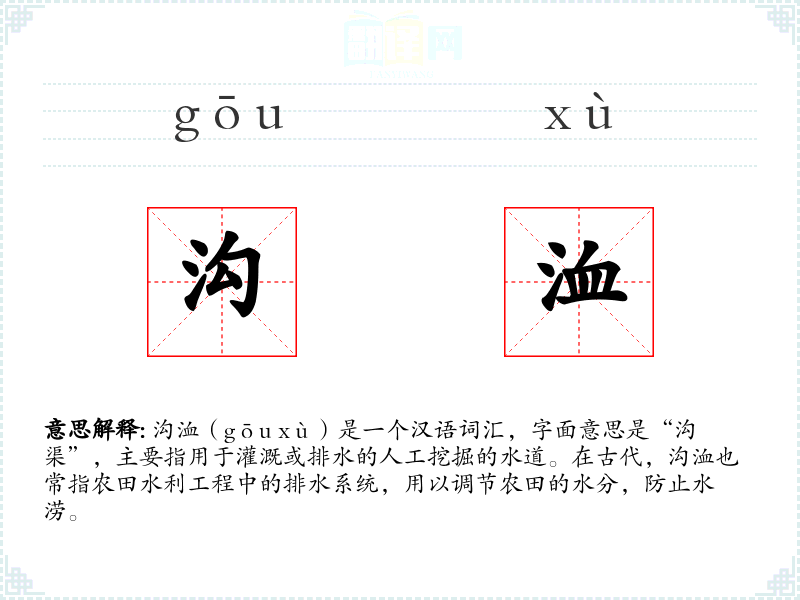 沟洫(gōu xù)是一个汉语词汇,字面意思是“沟渠”,主要指用于灌溉或排水的人工挖掘的水道。在古代,沟洫也常指农田水利工程中的排水系统,用以调节农田的水分,防止水涝。
