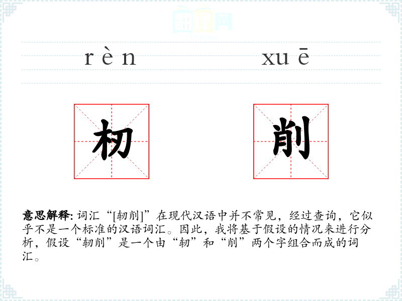 词汇“[轫削]”在现代汉语中并不常见,经过查询,它似乎不是一个标准的汉语词汇。因此,我将基于假设的情况来进行分析,假设“轫削”是一个由“轫”和“削”两个字组合而成的词汇。