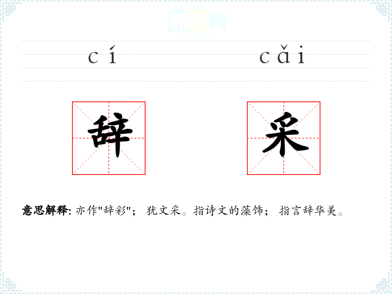 亦作"辞彩"; 犹文采。指诗文的藻饰; 指言辞华美。